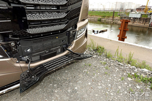 整车中网采用了黑色涂装,如果使用银色涂装,五段式的大尺寸中网让人看上去很像五只展翅翱翔的海鸥。并且在中网的最下方,S-WAY和斯堪尼亚车型的设计思路相同,可以将中网下翻,使其成为一个可乘坐、可站立的登车踏板。此外,这台S-WAY同样配备了毫米波雷达,提供防碰撞预警以及ACC自适应巡航功能。