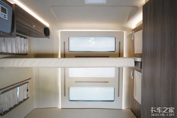 上下卧铺分别达到了70cm的宽度,虽然数据不算很夸张,但是单独一位卡友的休息是可以满足的。此外,上下两张卧铺可以实现拼接,这样宽度就达到了1米4左右,作为夫妻车来说,这样的宽度虽然不及家中的床,但是相比其他车型而言,能最大程度的满足卡友、卡嫂的正常休息。