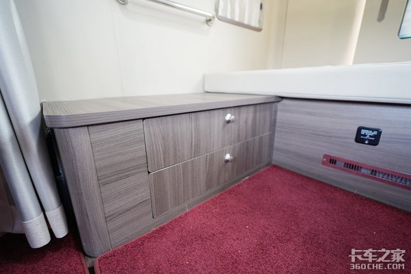 此外,在侧面还搭载了一个可折叠式的桌子,并且具备电磁炉功能,长途跋涉难免想吃一口新鲜食物或者热饭,生活舱上的的电磁炉让你轻松享受到家中的美味。并且在卧铺下方还包含了冰箱以及暖风出风口的设定,这些配置虽然在传统牵引车上都具备,但是在JH6+生活舱上,这些配置不仅更加实用而且尺寸都更大,对于车上生活质量的提升显而易见。