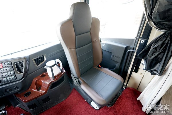 首先聊聊驾乘空间,实拍车型配备了解放高端车型独有的格拉默座椅,这款座椅皮质很细腻,支撑性很足,任何体型的卡友都能在上面找到最舒适的坐姿。此外,座椅的前后、高低、软硬、腰背部的支撑均可以单独调节,还配备了两档可调座椅通风以及座椅加热,不论是长途跋涉到哪个地区,这两项功能都能给卡友最及时的舒适感。