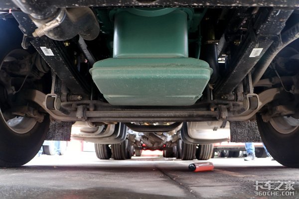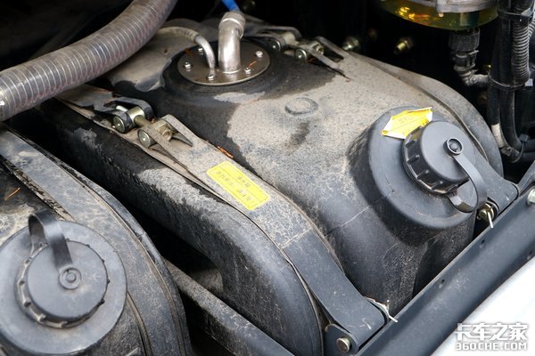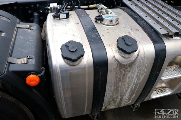油箱采用了铝合金材质,主副油箱相加为1100升,假如按照40升/百公里的油耗来计算,实拍车型的续航里程依旧接近3000km左右,这样的续航里程跑全国各地的中长途运输都不成问题。并且实拍车型还配备了双腔油箱功能,即便是应对寒冷天气启动车辆,都不是一件难事。