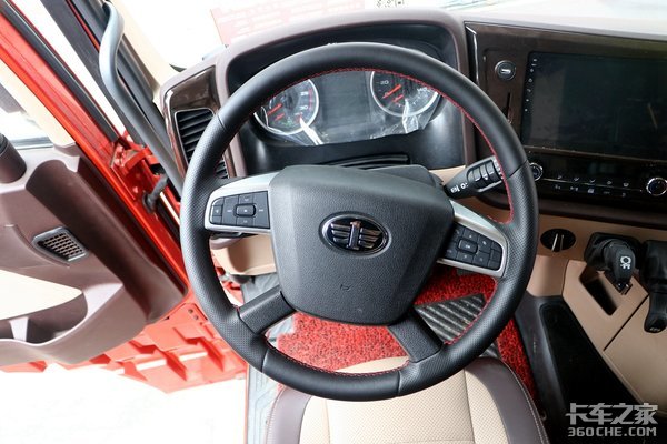 在仪表台和方向盘区域,和传统的JH6车型相似,主车、挂车的制动气刹成在面板上,不仅方便操作,还减少了空间占用面积。换挡机构采用了旋钮式换挡,这样让卡友在移动时不用担心误触挡杆,让行动更便捷。