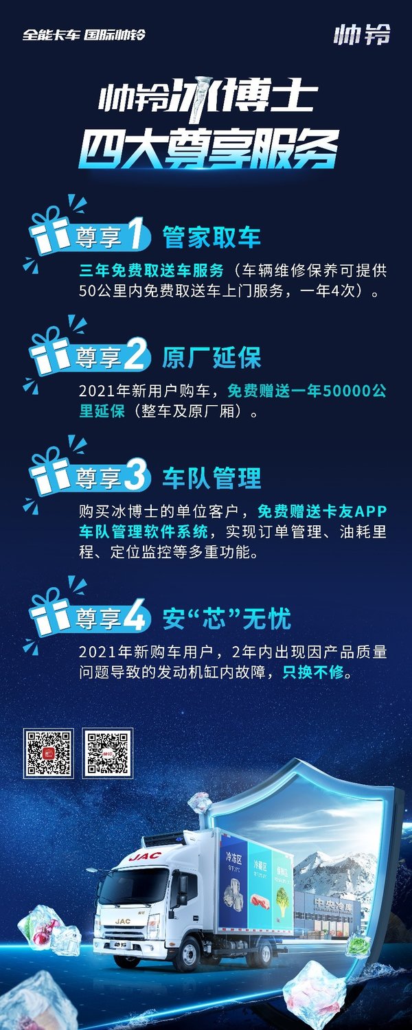 此外,帅铃冰博士还针对2021年新购车用户赠送1年5万公里的延保服务,并保证在2年内,若车辆出现质量问题导致的发动机缸内故障,只换不修等服务内容,让卡友放心买车,更放心用车。