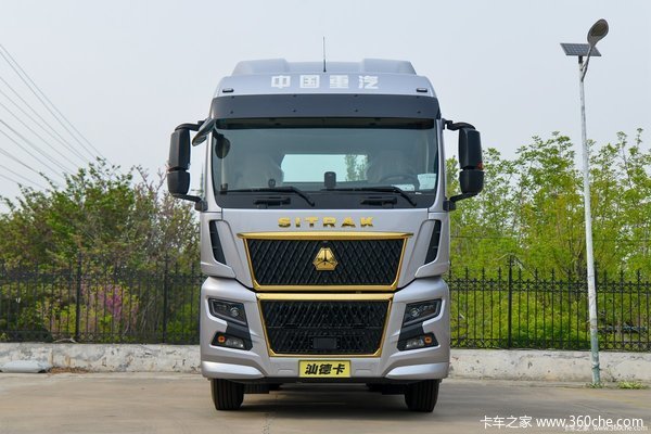 可以看到前脸上的汕德卡字母、重汽LOGO甚至进气格栅的边框都采用鎏金配色,显示了这款车的高端属性。