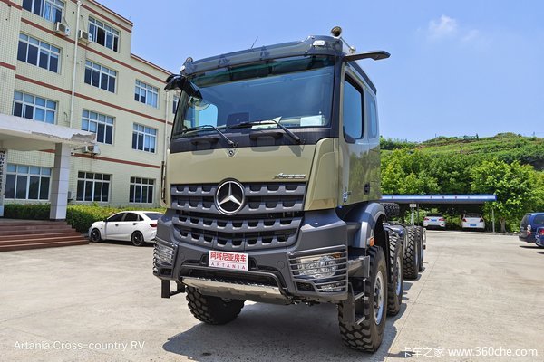 【卡车之家 原创】作为欧卡七姐妹之一的奔驰,对于国内很多用户来说,都是可望不可及的存在,但是在越野车领域中,以奔驰底盘改装的各种越野旅居车倒是在国内市场中很受欢迎,今天就来为大家介绍一款奔驰Arocs 4152E6 8x8越野车底盘,据悉,这款车目前的市场价约200万。