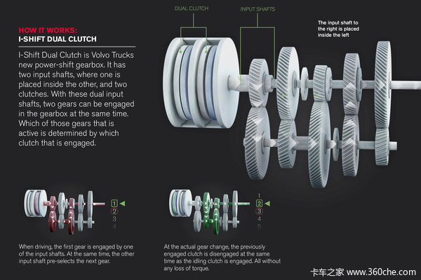 说回到卡车上,除了手动挡外,似乎就只听说过AMT变速器了。但其实,国外一些高端卡车如沃尔沃的i-SHIFT就使用了DCT双离合的结构。那么什么是DCT,双离合结构又会为卡车司机带来什么好处呢?