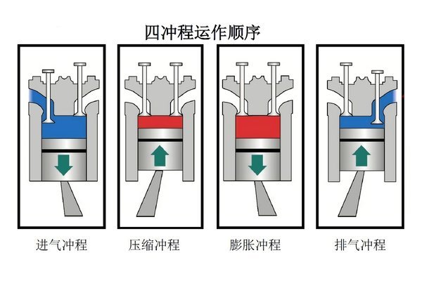 其中,每次点火活塞要进行四次运动,第一次向下运动吸入空气和燃油(直喷采用喷射的方式);第二次运动对燃油和空气进行压缩,到顶端后点火;第三次活塞受爆燃冲击产生向下的力量做功运动;第四次活塞上行,排出废气。而真正有用的,只有做功这一个冲程,也就是上面图上的膨胀冲程。