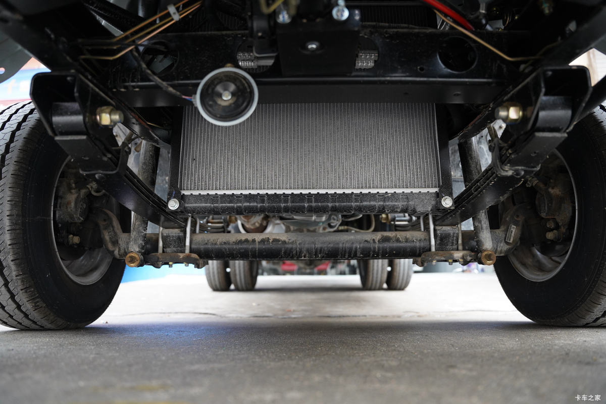 受制于成本因素,车辆油箱采用了铁质设计,空调冷凝散热器被安装在车架左侧油箱前端。但是冷凝器离地间隙较低,而且也缺乏防护措施易损坏,希望后续厂家可以对此进行改进。