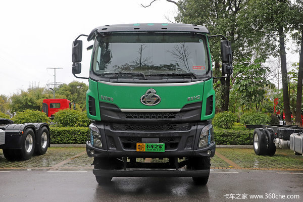 在配置方面,整车配有全浮式排半驾驶室、气囊减震座椅、支持倒车影像的多媒体大屏、PTC电加热空调、取力器开关、E\P节油开关、轴间和轮间差速锁等等。