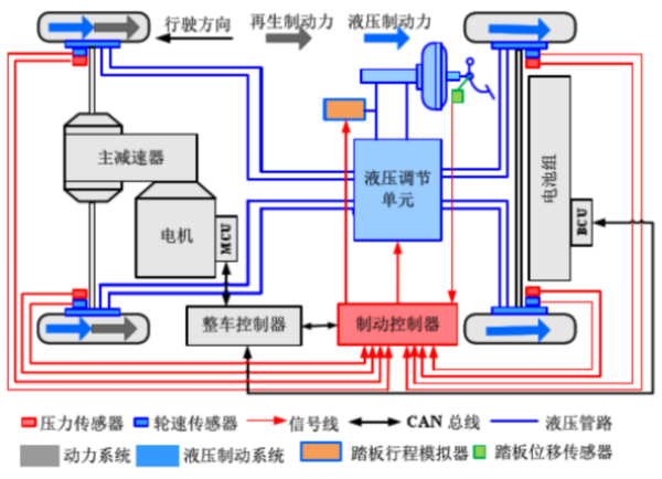 所以接着CRBS就来了,它的中文名称是协作制动回馈系统。与RBS系统不同的是,CRBS系统下,制动踏板和刹车从机械连接改为了线控,也就是解耦,而所谓的解耦就是两者之间的工作并不是同步的,在CRBS系统下,我们踩下刹车时,车辆会优先利用上文提到的动能回收来进行电制动,而机械刹车由一个线控制动的控制器单元控制,依据目标制动力输入信号来执行操作。