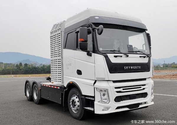 创维牌6x4牵引车采用的是氢燃料电池技术路线,动力方面,这款创维重卡采用的是来自天津荣盛盟固利的锰酸锂蓄电池,燃料电池为质子交换膜燃料电池,双电机设计,单电机的额定功率为103.7千瓦,峰值功率为180千瓦。