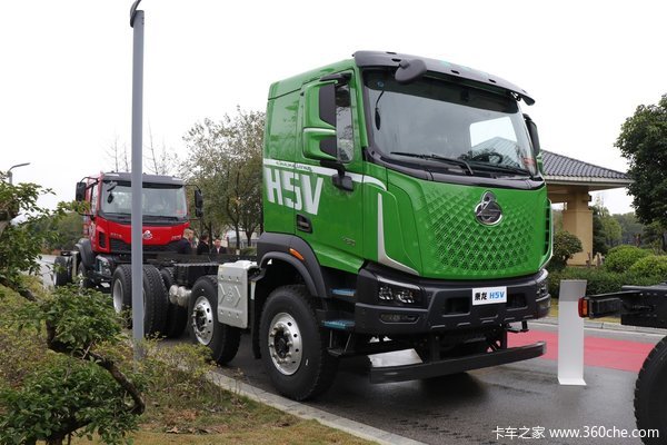 底盘方面,实车的车架规格为300(8+4),配备350升铝合金油箱、悬架规格为11/11/13的多片钢板弹簧悬架,轮胎规格为11.00R20 18PR。
