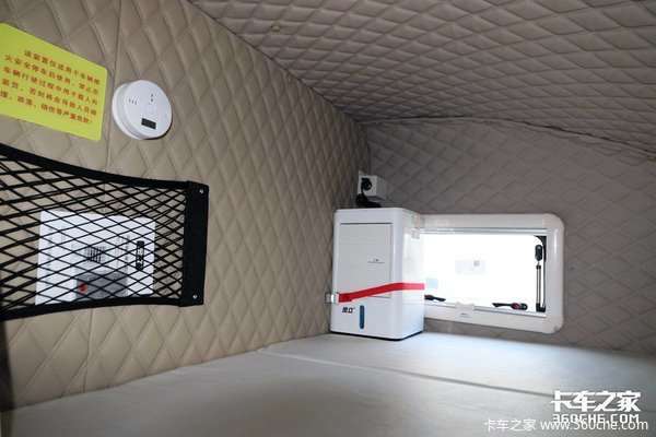 说完底盘,咱们来看这台车装配的生活舱。来到驾驶室内,可以看到通往睡眠舱的舱门就在副驾驶位上方,亲测进出不算费劲。睡眠舱内部卧铺宽度接近1米5,长度超过2米,基本任何身材的卡友都可以里面自由伸展。