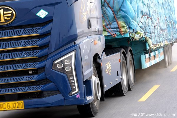 首先介绍本次我们一起同行的全新JH6具体配置。这次我们跟随的是一台智尊款四季版的顶配车型,发动机方面搭载全新的4.0版本15升630马力LNG发动机,最大扭矩2800牛·米。与之匹配的变速箱是法士特的16挡AMT变速箱,最高挡为超速挡。后桥为全新的440轻量化后桥,速比为3.417。