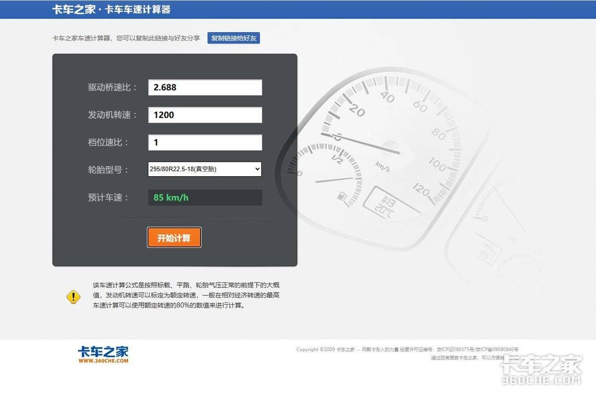 根据卡车之家卡车车速计算器计算,车辆在发动机1200转的经济转速下,时速可以达到85km/h,保证车辆的实效性。真正实现了“大马力、小速比、高车速、低转速”的高效运营模式。
