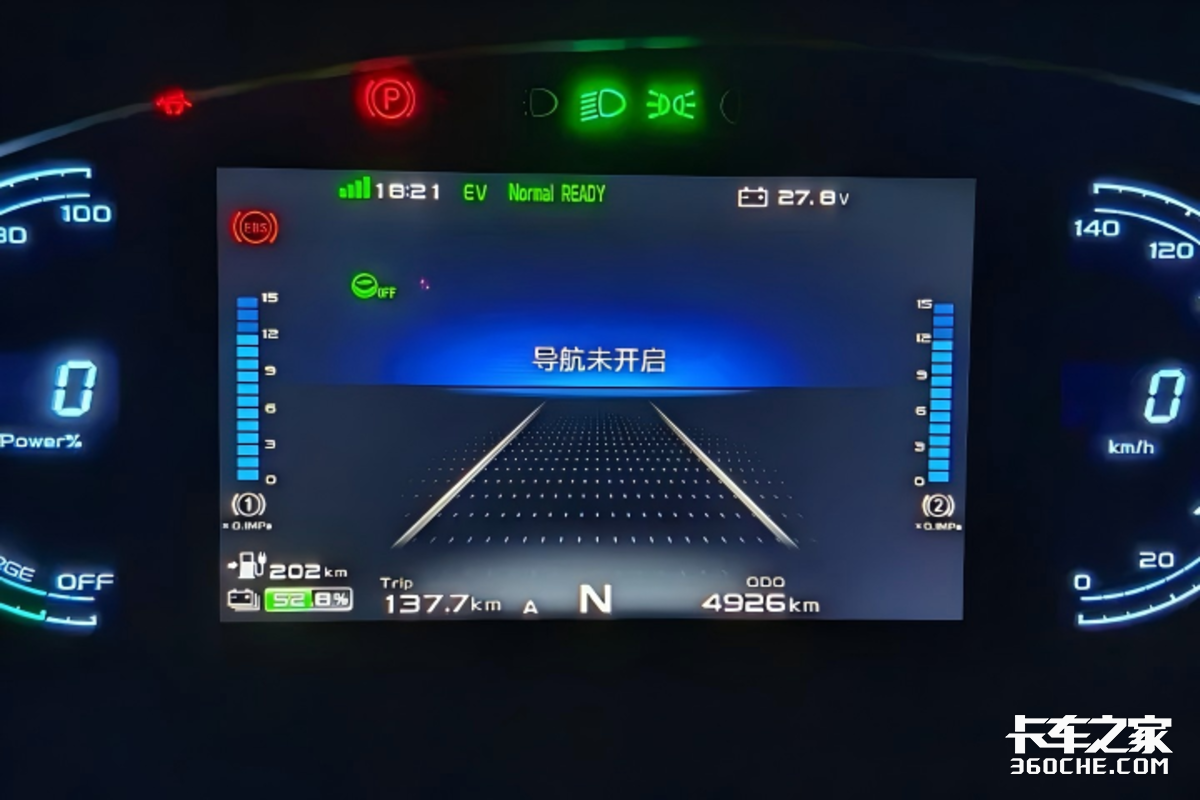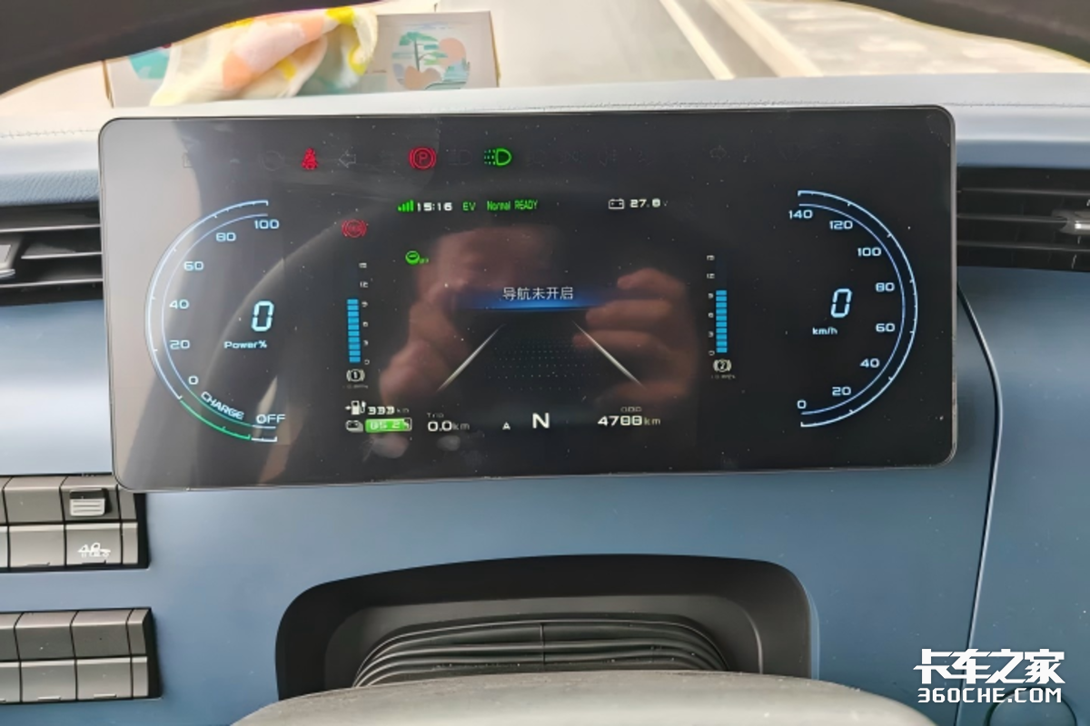 出发前卡车表显电量85.2%,测试结束时表显电量52.8%,测试车辆电池总电量为513度。通过卡车之家的测算,本次在山城重庆的实际路况下,平均电耗约为每公里1.2度。若切换至平原地区,采用半程空载、半程满载(标载)的典型工况,可轻松实现每公里低于1度电的能耗水平。