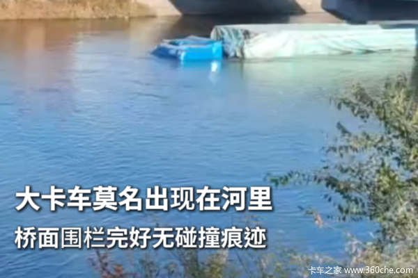 大卡车莫名出现在河里,桥面围栏完好无碰撞痕迹。