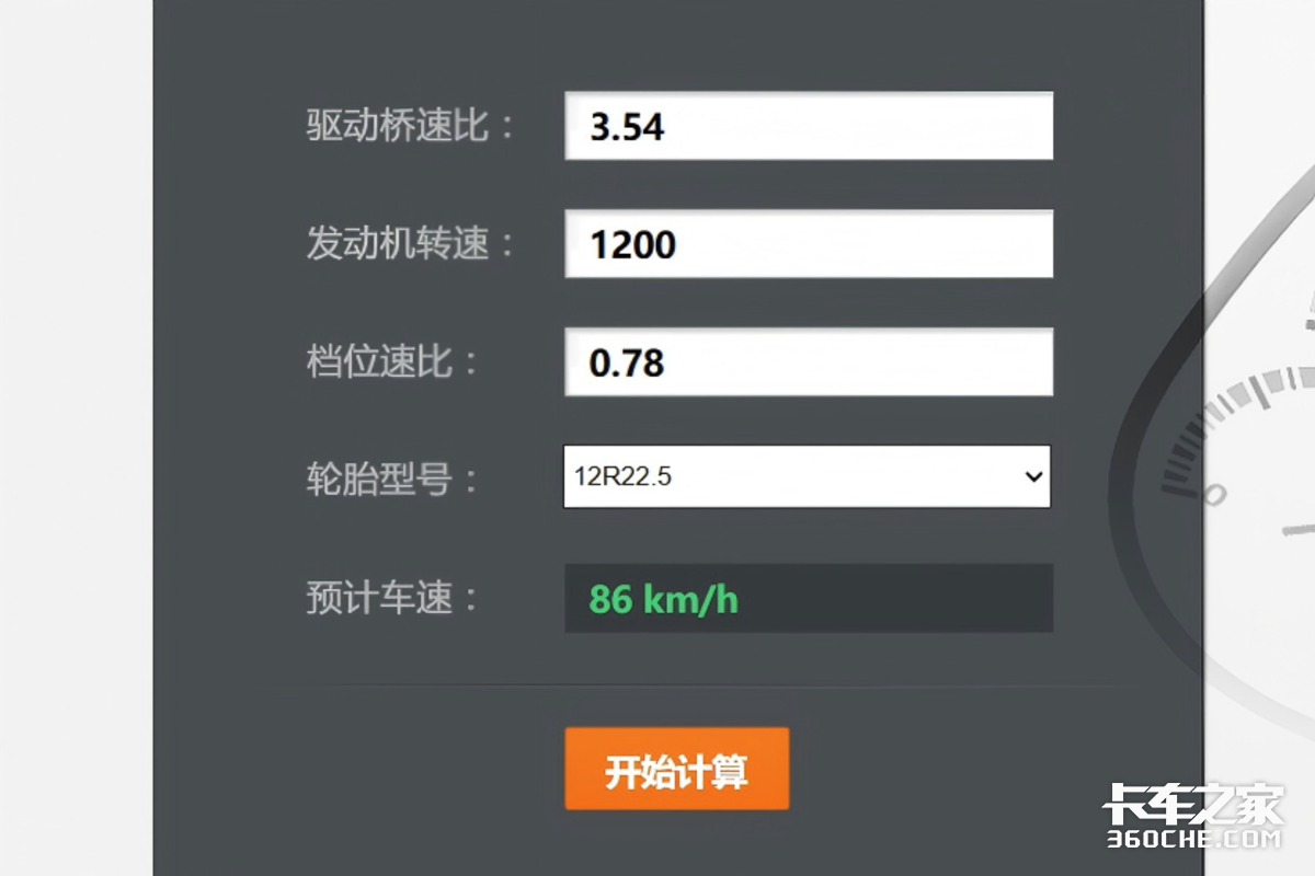 通过卡车之家车速计算器计算,在发动机转速在1200转时,车辆车速为86km/h。此时既能让发动机保持在经济运转区间,又能保持整车车速提升时效。