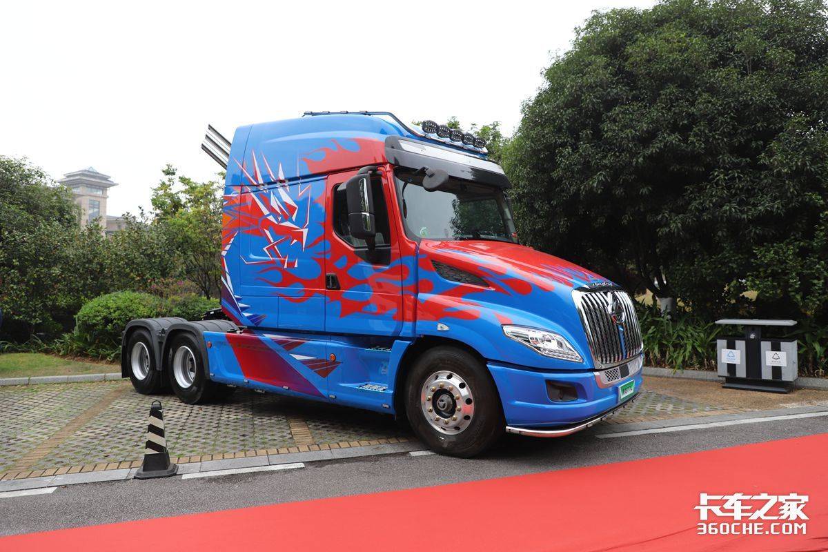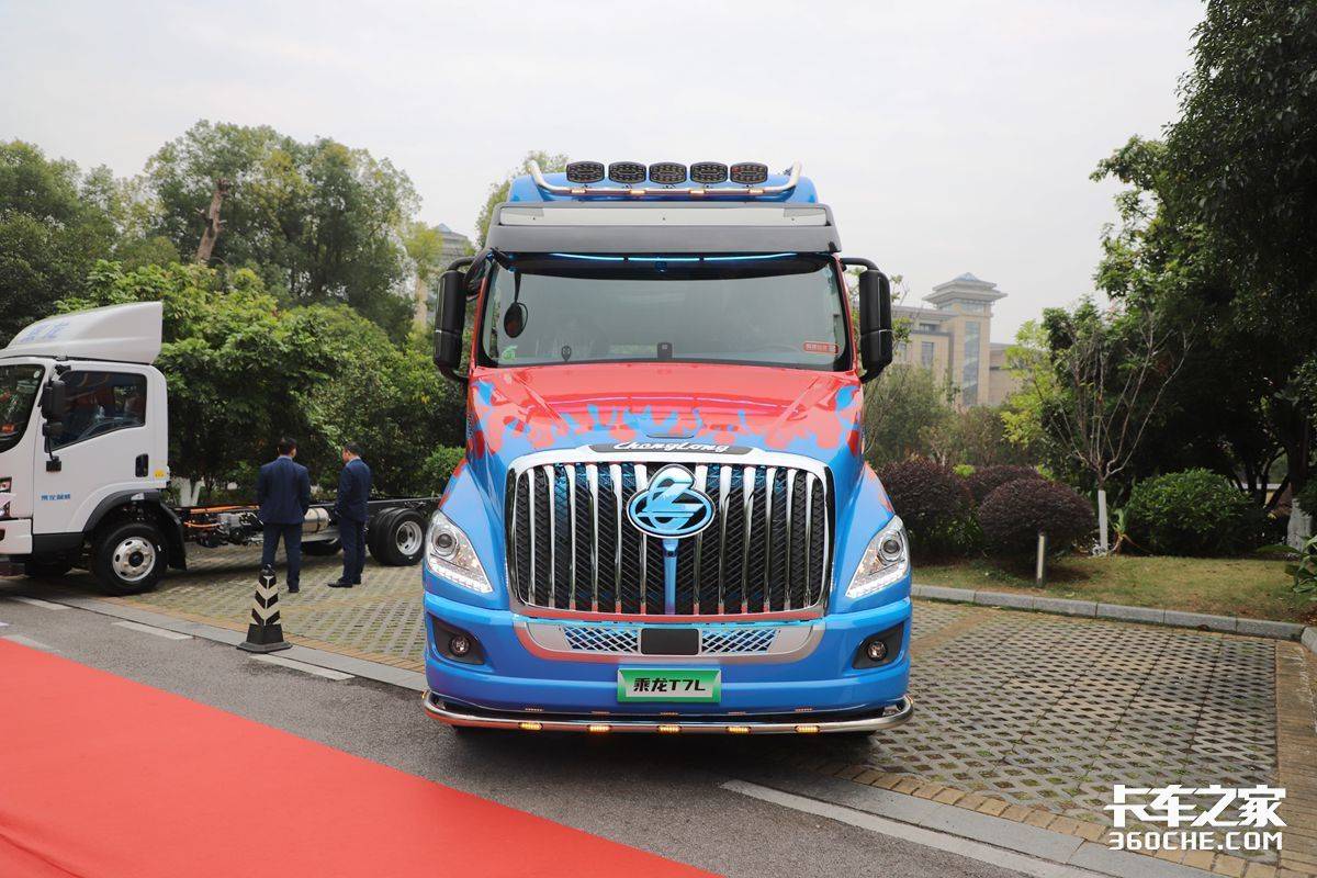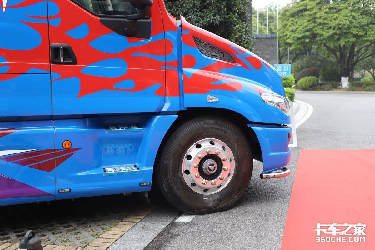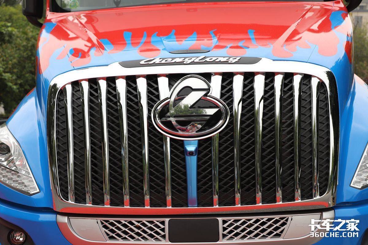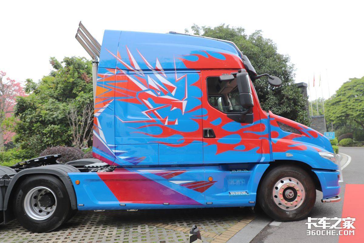 乘龙T7L整车贴了红蓝色车衣,引擎盖上红蓝交织的火焰拉花,以及车侧面的机甲龙的拉花,加上后面六个超大的排气管。这不仅像变形金刚里威武霸气的擎天柱,还使得整车尽显磅礴气势。在晚上,车头上的射灯和能发光的logo,绝对能成为道路上最靓的仔,有着100%的回头率。