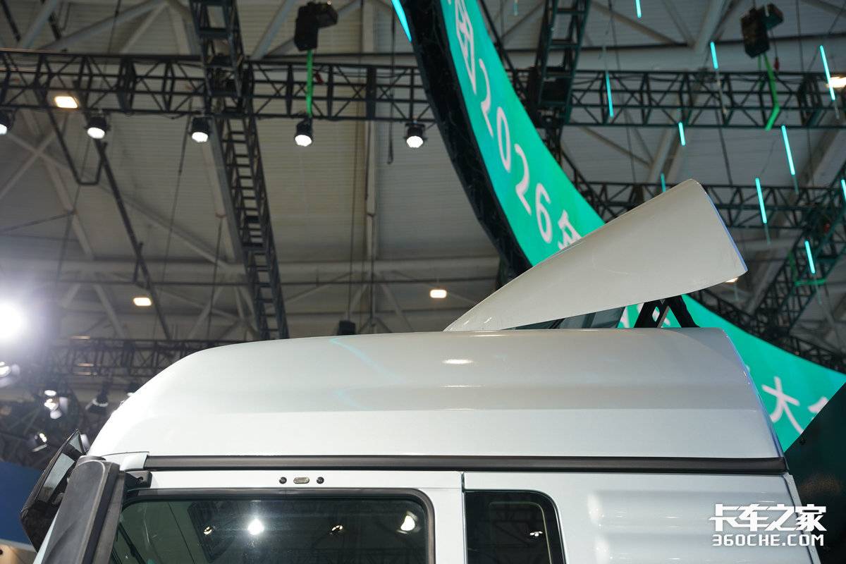 该车驾驶室顶部的全新导流罩经过空气动力学优化,能够梳理车顶气流,与整车造型协同工作,进一步降低风阻系数,从而为整车实现更低的能耗贡献一份力量。