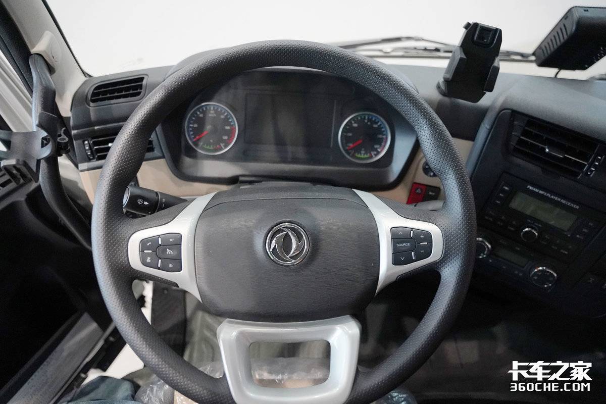 进入驾驶室,尽管东风天锦KR采用的是平顶驾驶室,但其纯地板的设计带来了令人惊喜的宽敞空间。车内布局开阔,主副驾之间移动自如,这一设计不仅让日常上下车变得轻松便捷,也保证了日常驾乘的舒适性。